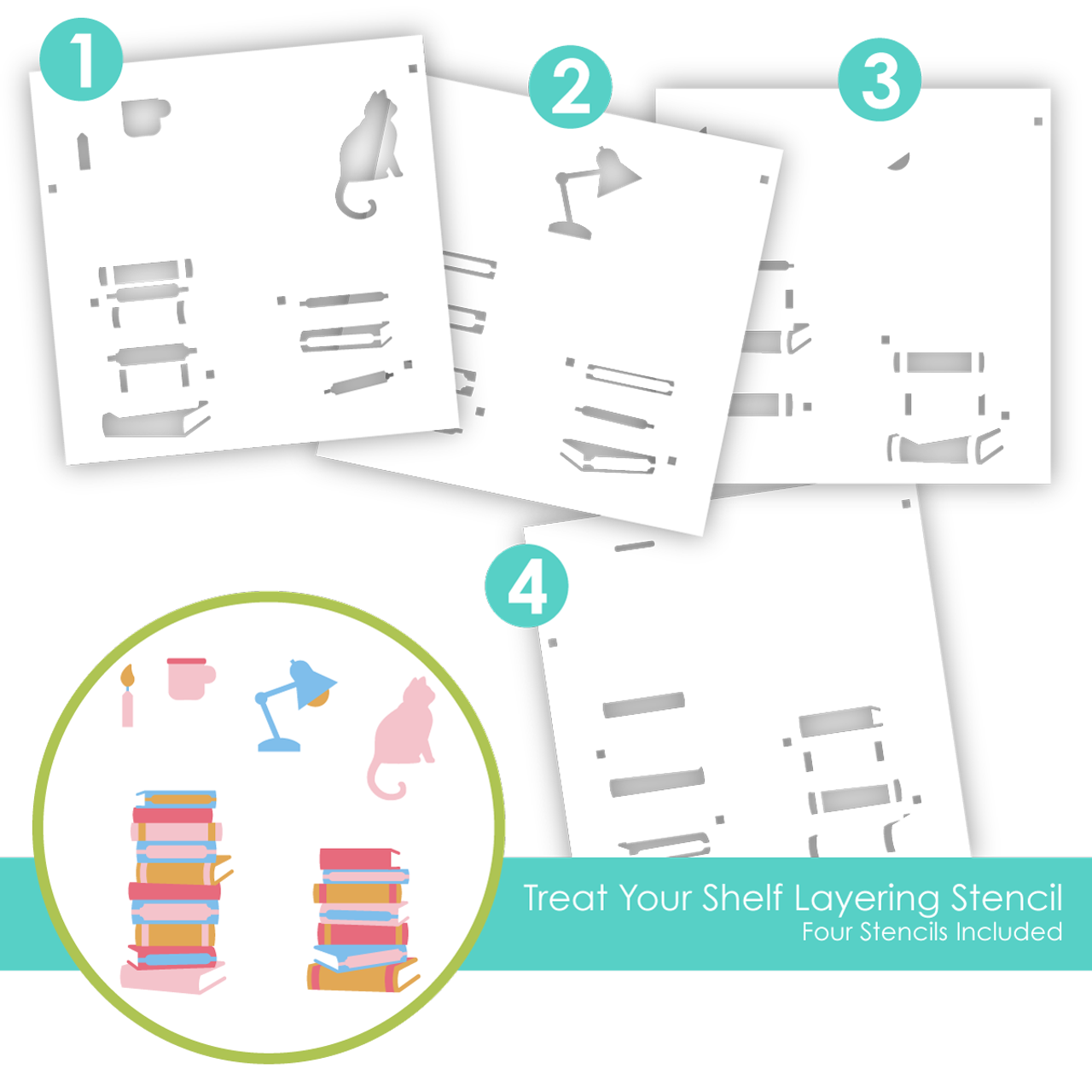 Layer up your love for books with Treat Your Shelf Layering Stencil! This set of 4 stencils layer together to create stacks of books topped with cozy details like a cat, lamp, candle, and mug. Alignment squares on each stencil layer make it easy to ensure your design lines up perfectly as you blend. Use with your favorite TE Premium Ink or try layering with other mediums like TE Happy Medium, Astro Paste, and more!